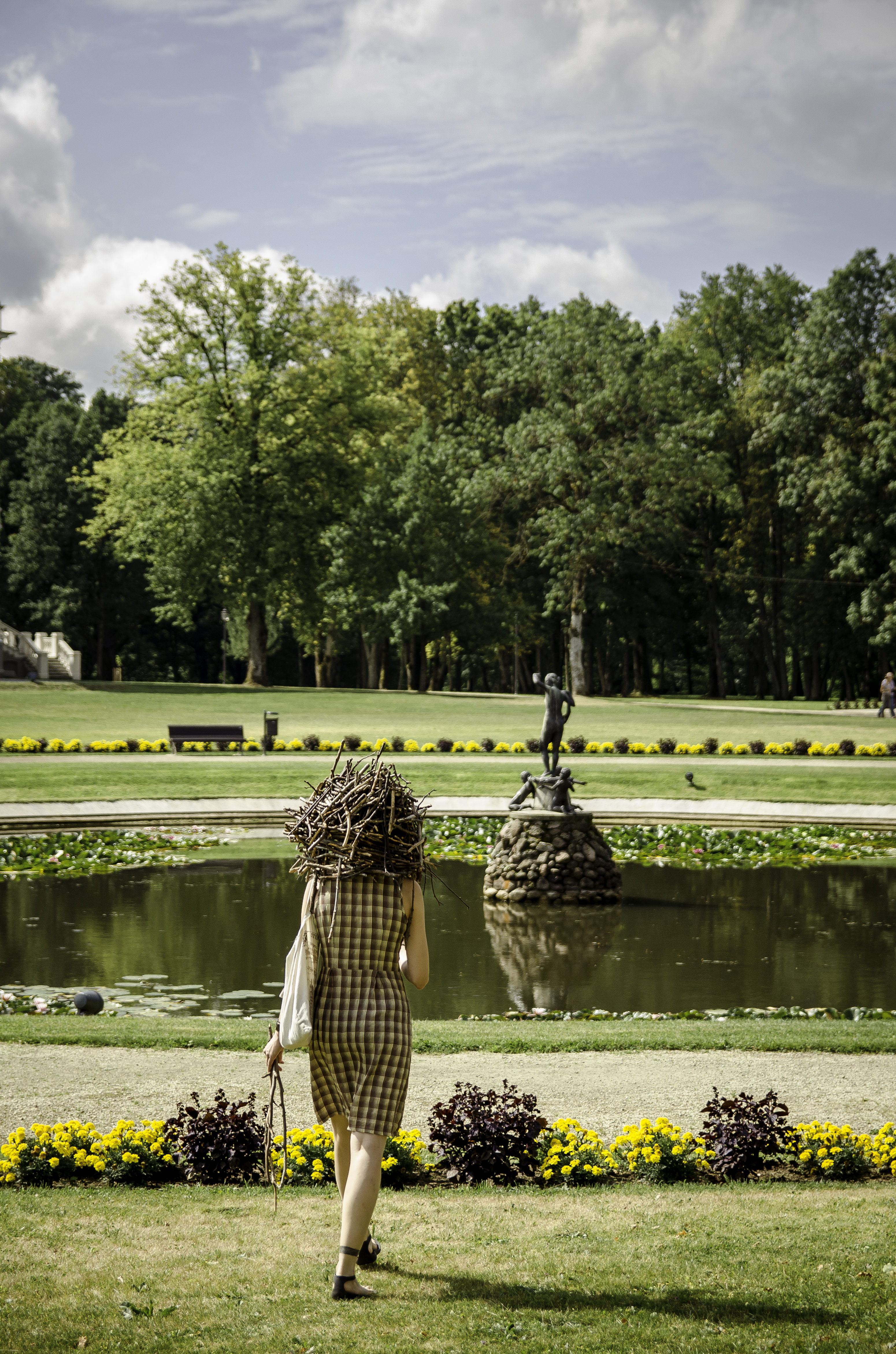 Performance started two weeks before the performance started. I was collecting sticks of pine and various other trees in the forest in Nida, LT. Those were hot sunny days, the air smelled like honey, and during my lunch break, I would go to the forest, eat wild raspberries and blackberries, and gather sticks. I would come back to my room and glue the sticks to the carcass. It seemed such a slow process. The performance continued in the bus, people were curious about the headdress, while in Plungė the action started as soon as I left the bus I got there with and lasted for an hour and a half.