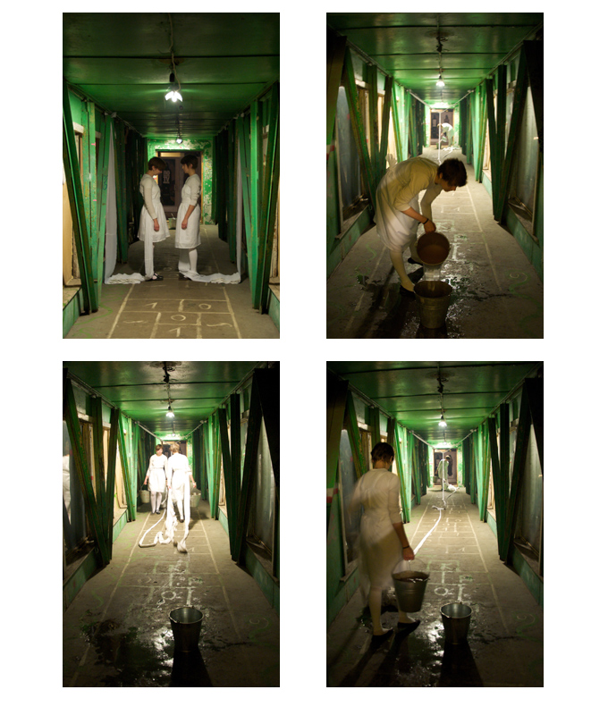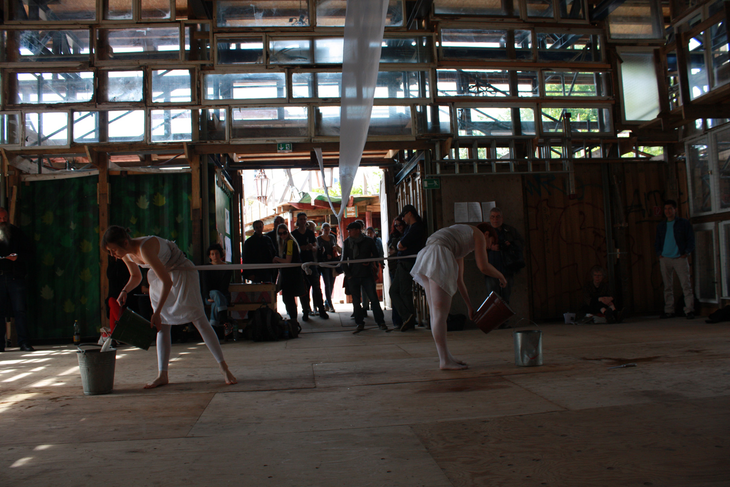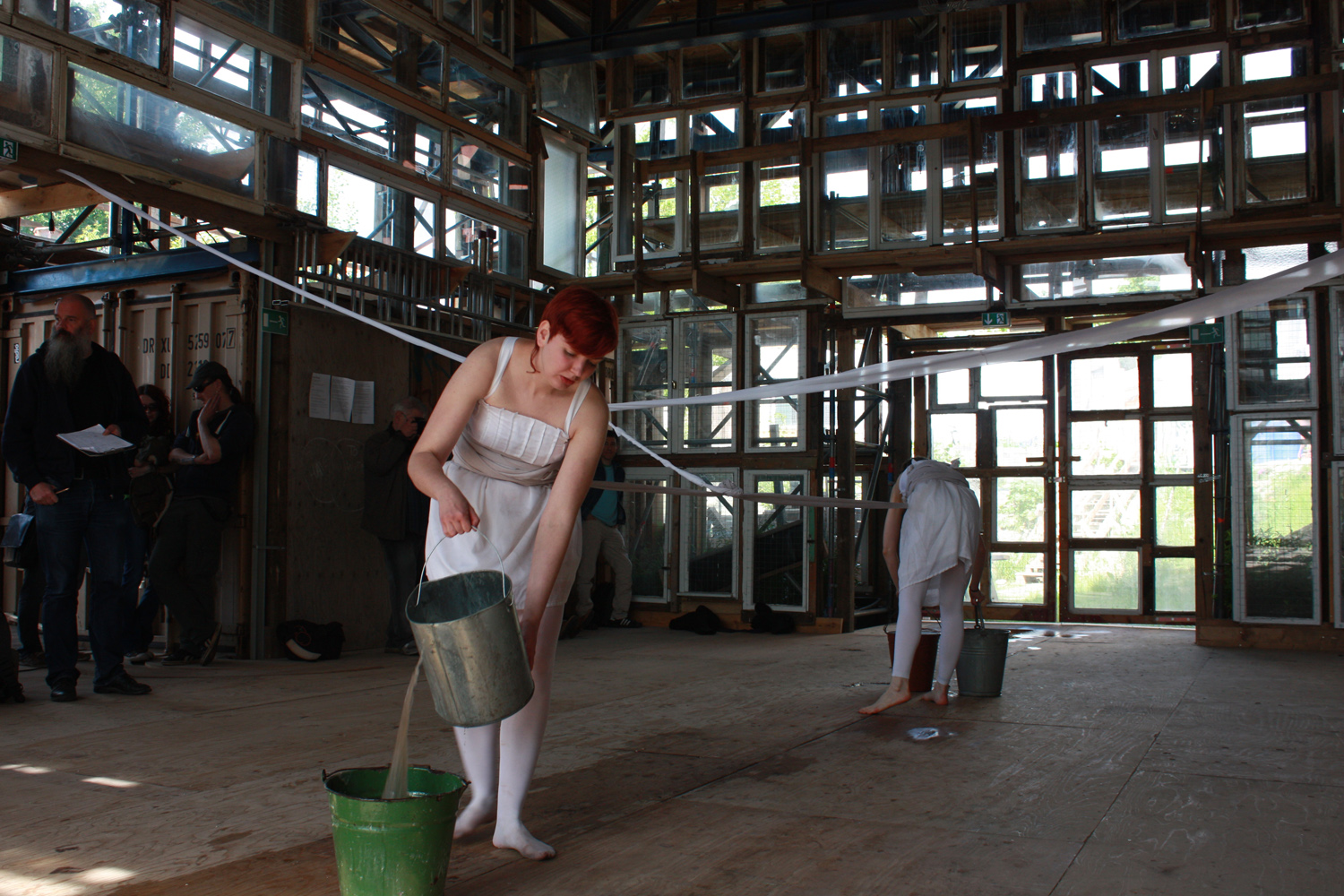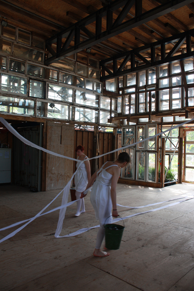 We had four aluminium buckets for this performance and lots and lots of long broad ribbon. We filled 2 of the buckets with the water from a nearby river, and fastened the ribbons to the sides of the space. Then we started walking from one side of the space towards the other, our paths crossing each time. At both ends of the room we would leave an empty bucket, and we would carry the full bucket through the space, put the water into an empty one, leave the one that’s been emptied and take the full. We would wash the ribbons sometimes, and when they’d be wet, they’d be making this beautiful snake-like sound. The water would get more and more dirty, and the ribbons would get tighter, and we’d be drawn closer together bit by bit. It ended when the ribbons were so short and tight that we couldn’t move and I couldn’t breath any longer.
