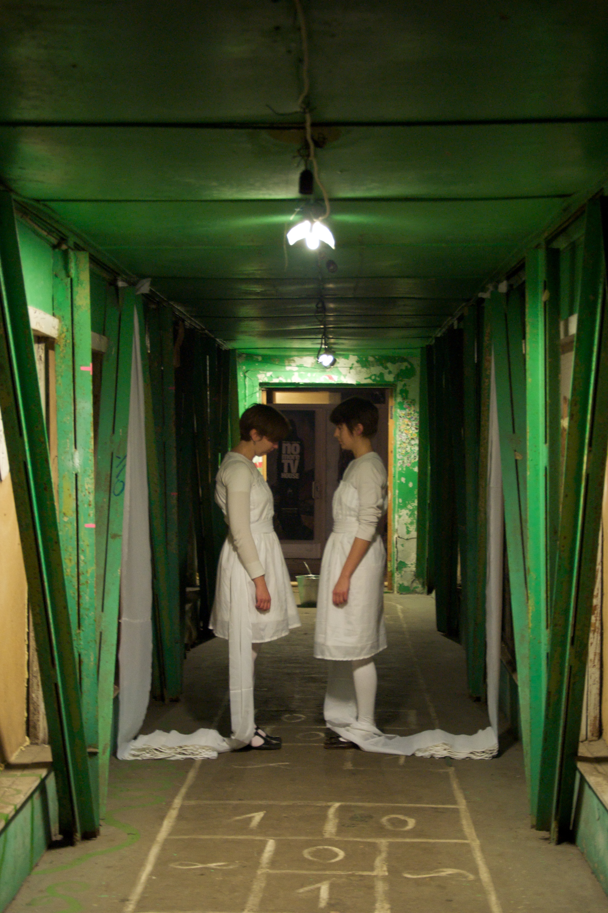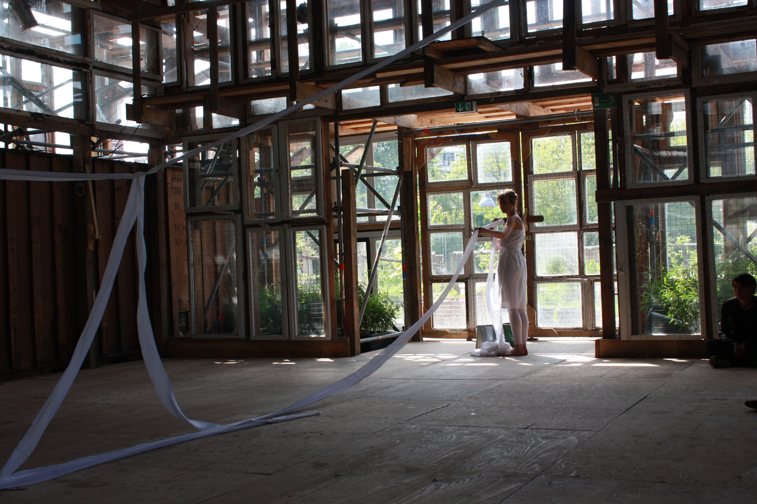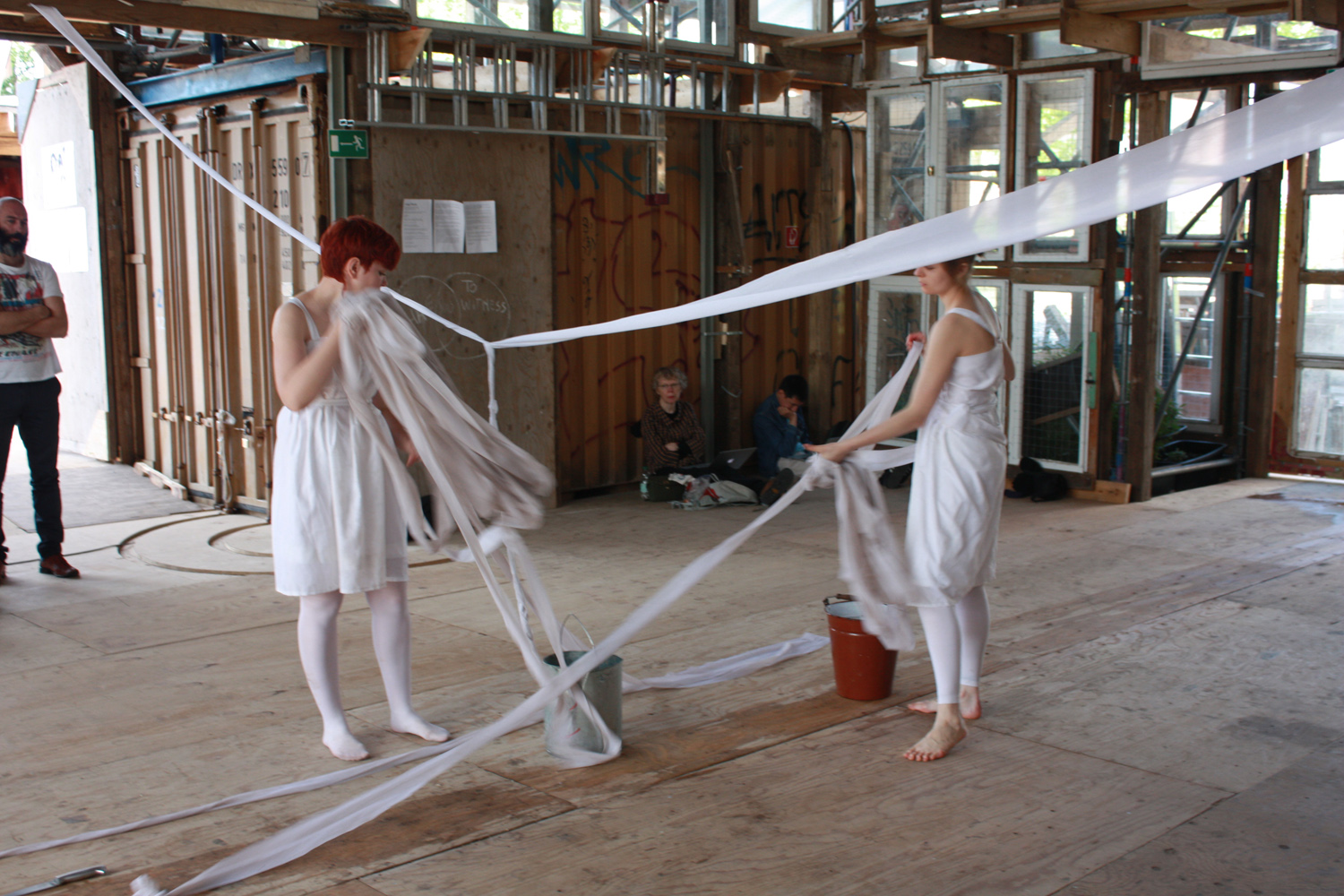 We had four aluminium buckets for this performance and lots and lots of long broad ribbon. We filled 2 of the buckets with the water from a nearby river, and fastened the ribbons to the sides of the space. Then we started walking from one side of the space towards the other, our paths crossing each time. At both ends of the room we would leave an empty bucket, and we would carry the full bucket through the space, put the water into an empty one, leave the one that’s been emptied and take the full. We would wash the ribbons sometimes, and when they’d be wet, they’d be making this beautiful snake-like sound. The water would get more and more dirty, and the ribbons would get tighter, and we’d be drawn closer together bit by bit. It ended when the ribbons were so short and tight that we couldn’t move and I couldn’t breath any longer.