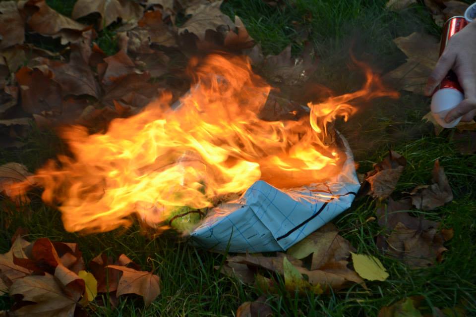 Performance started with Vaida banging the floor with her stick and screaming “Spektaklis!” (“Spectacle / Performance!), and me starting to cur her dress: from down upwards in a continuous line. When I cut it off entirely, I wrapped it around my head, still going in circles around Vaida. As soon as it was all on, and I couldn’t see a bit, I put my head into a bowl of naphtha, soaked the red ribbon, and drew a long wet line of naphtha with my face on the floor. I got back to Vaida, and wrapped a line of a ribbon on the end of her stick. Then I lit it. As soon as I did, she lowered the stick to light the ribbon. I took a handfull of Bengali lights and lit them on my behalf.