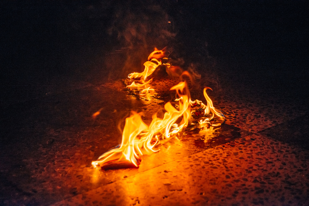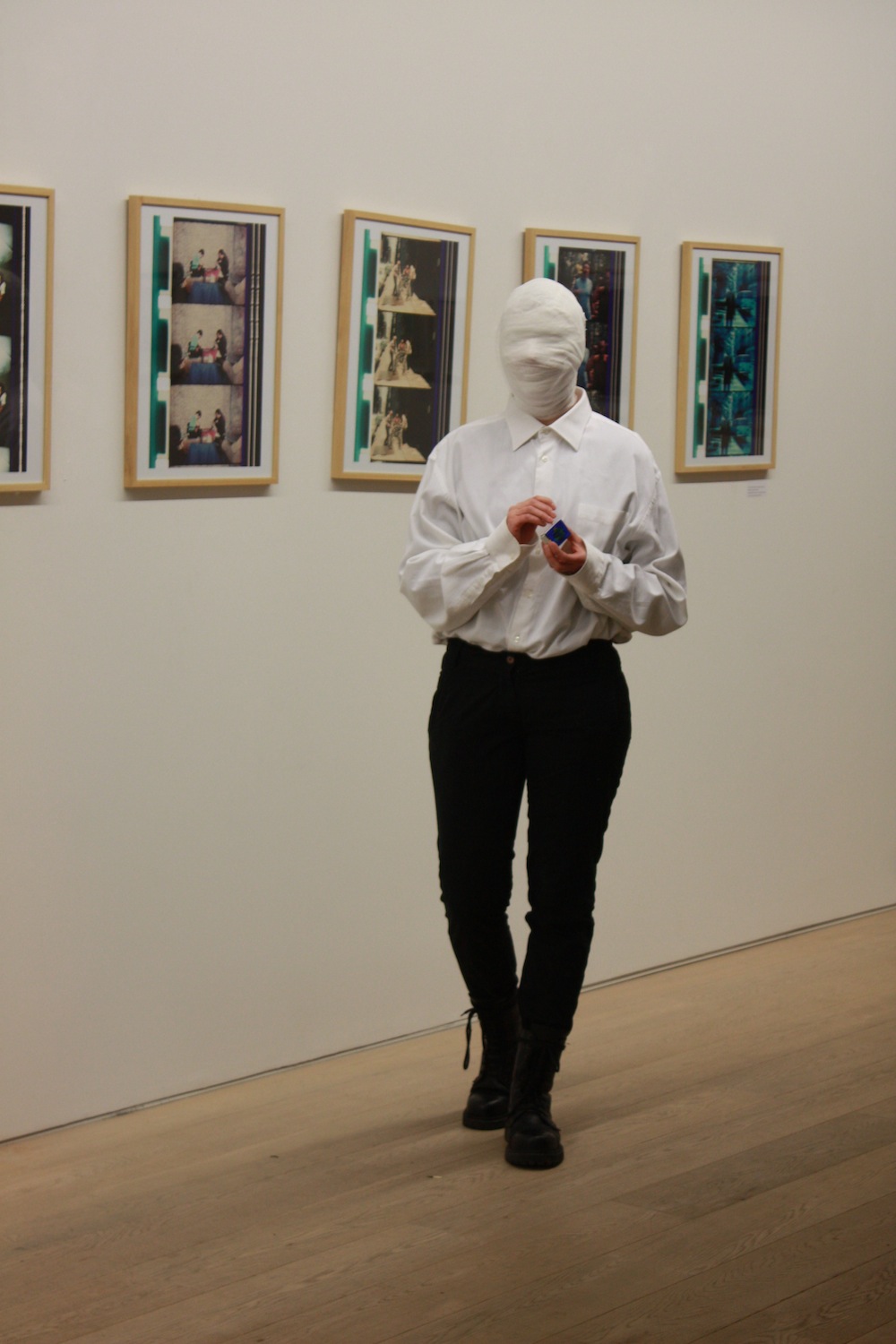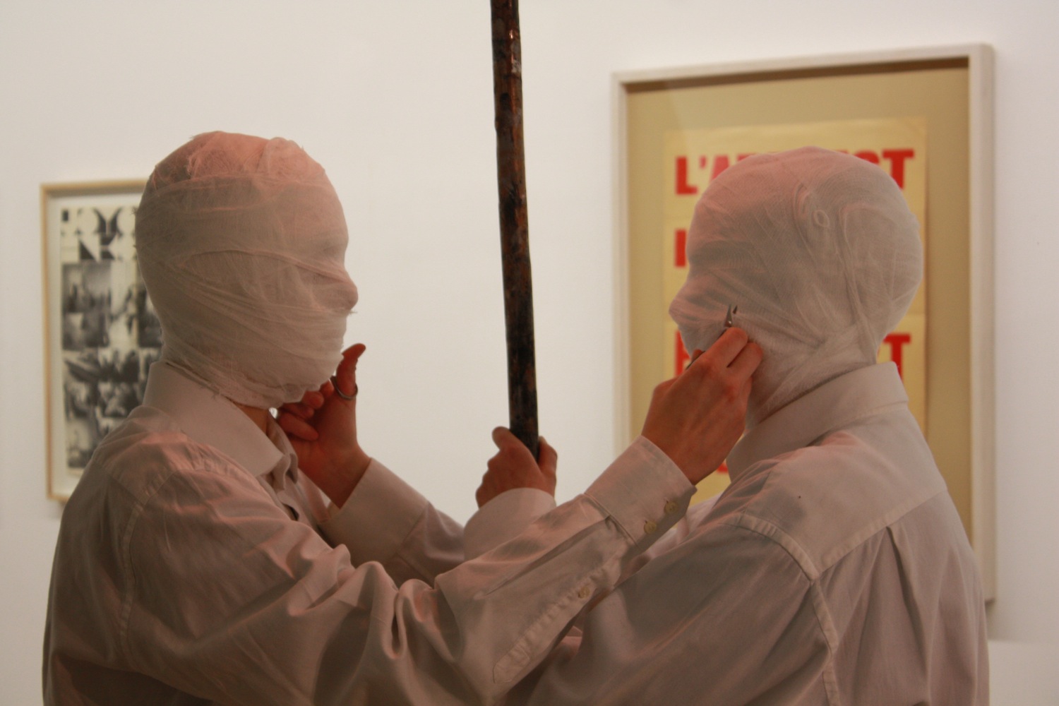 We are standing in the furthest possible points of the gallery, opposite to each other, with our heads wrapped with bandage so that we would not be able to see anything and nobody would see our faces. One of us starts walking with a box of matches, lighting one match each step of the way, the other one is walking from the opposite side with a torch soaked in kerosene, so that the meeting of the two would without a doubt result in fire. And indeed, when we meet, we light up the torch, and – while holding it with our left hands – we take out small scissors from our pockets and begin cutting bandages from each others’ faces. Scissors are too sharp to be confident about not hurting each other. The performance ends with both of us bandage-less and the torch almost out.