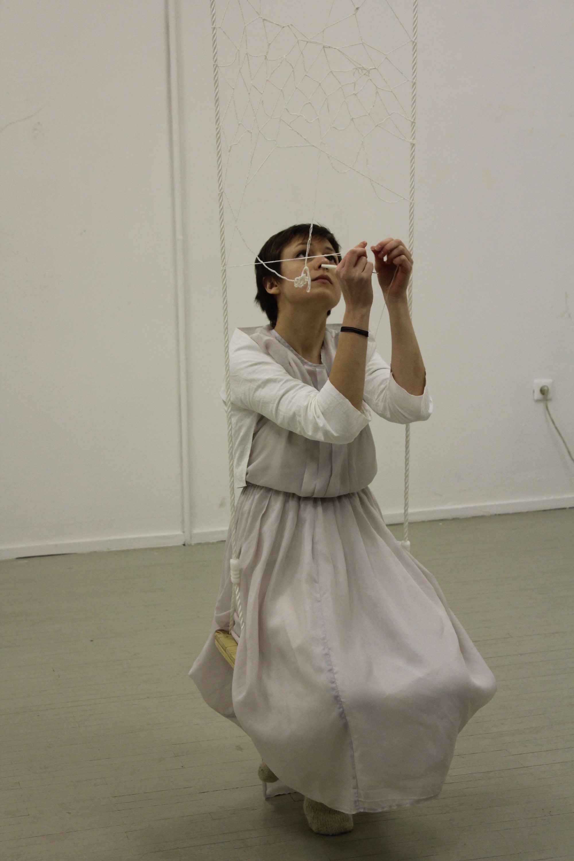 Sometimes I swing in order to pull away from my own center, sometimes – in order to start my mechanism anew. With every swing forward and back – a fresh breath of air, a series of them. The blood runs faster as my body’s filled with oxygen, everything looks clearer: contours, forms, textures. Then everything disappears again. So it goes until i bounce and jump and land soundly on the ground.