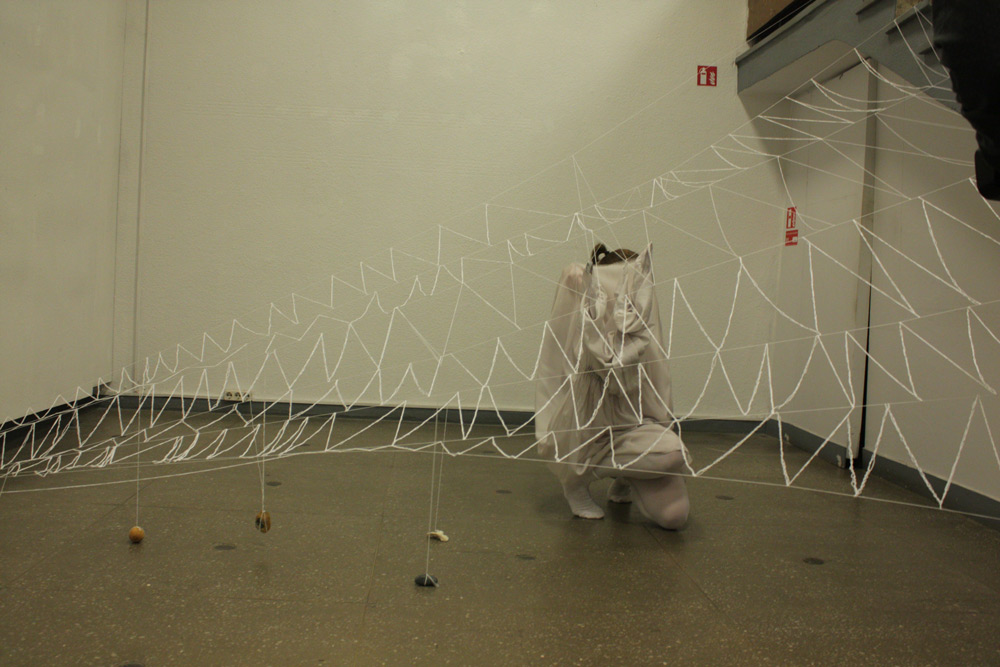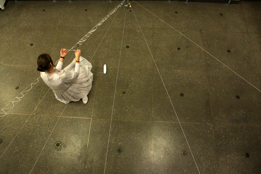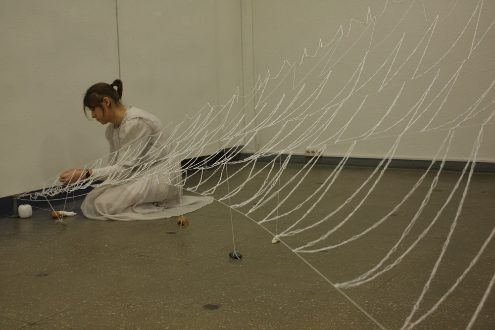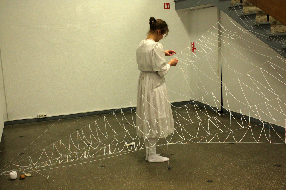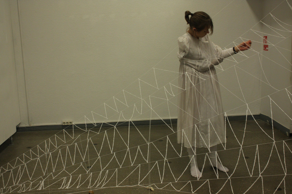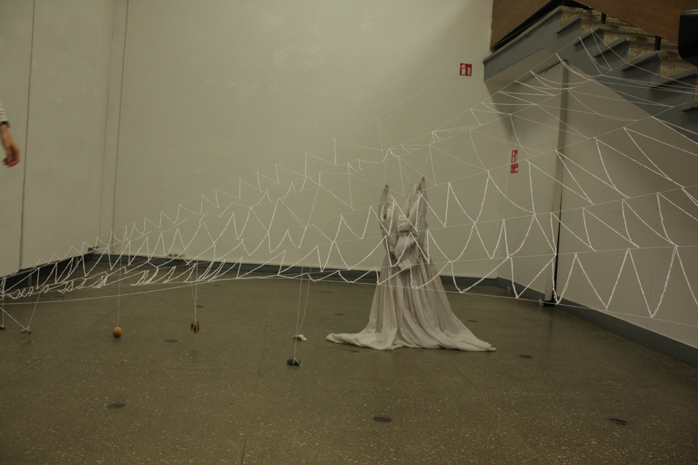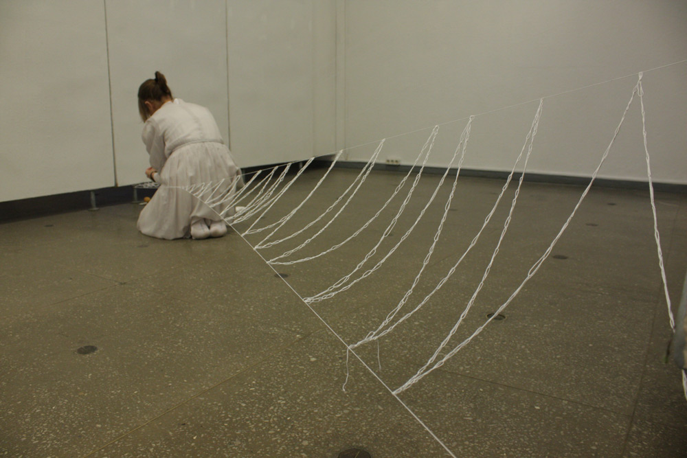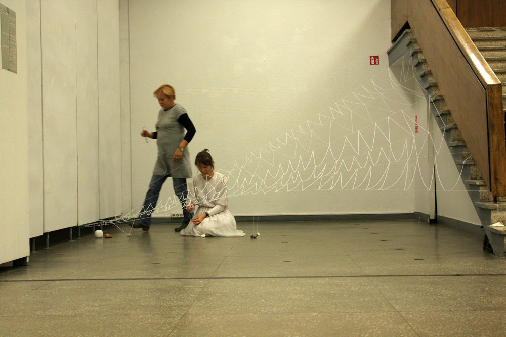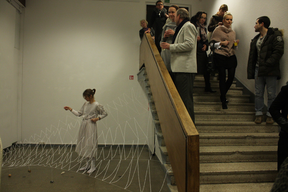The work was performed in Kaunas picture gallery on the 14th Now 2014, duration 7+ hrs. The installation that remains + video remained as a part of the exhibition in Kaunas Biennial, “THE SHROUD OF TIME“ (“Laiko drobulė”).