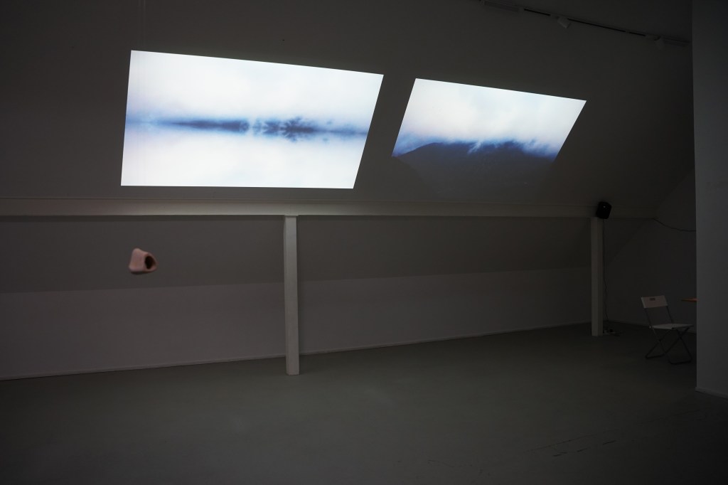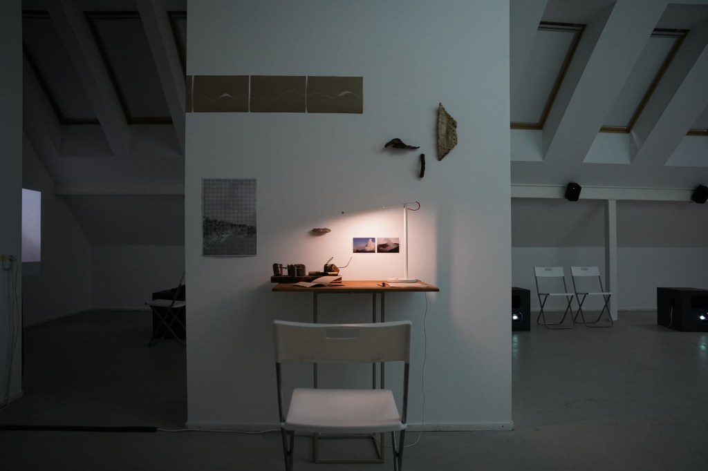 Opalescent by Daina Pupkevičiūtė is rather a dialogue than an exhibition. Sound and video materials and objects that participate in it are fragments, reverberations, paraphrases and reflections from the research project she is at the moment carrying out, within it she looks into the relationships between humans and nonhuman animals, plants and abiotic vectors in the context of climate crisis. This dialogue is a continuation of the research trajectories – relationalities, care and catastrophe – Daina has embarked on since 2018, expanding further. This time living, growing participants of the exhibition share the space of the gallery with the slowly moving fog, with sounds collected in the Alpine horizon as well as recorded in the studio as well as with the human voice.