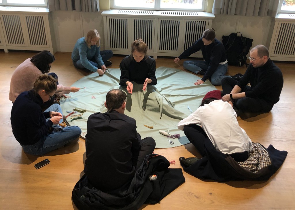 The performance Wounded Landscape III aimed to reflect on (human) relationship with the land and the landscape: how we inter:relate, how we perceive and define ourselves as individual and as a plural body through the links with the multiple living bodies that make the landscape. This reflection takes place via the body: through slow, monotonous movement of sewing and embroidery, with multiple bodies leaning against the fabric, and the slow unraveling of a conversation. The shared action, time and skirt-as-a-canvas become a space for the intimate sharing and slow presence.